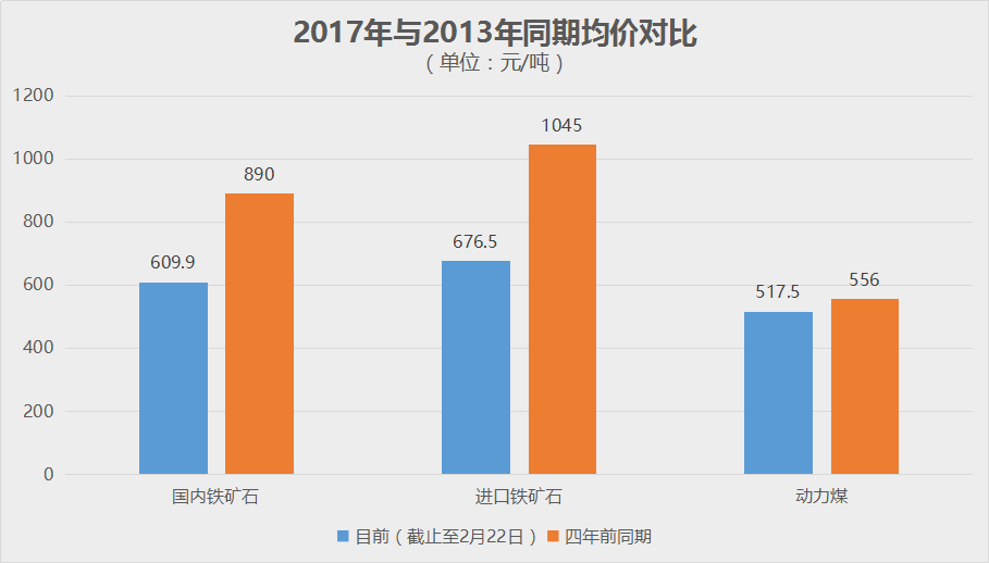 可以看出,盡管在2016年年底,煤炭價格經過一輪瘋狂上漲,但由于此前跌幅過大,目前價格并未恢復到當初的水平。而原本漲幅居后的國內鋼價,在春節之后這一輪瘋狂拉漲之后,漲幅已經后來居上。
